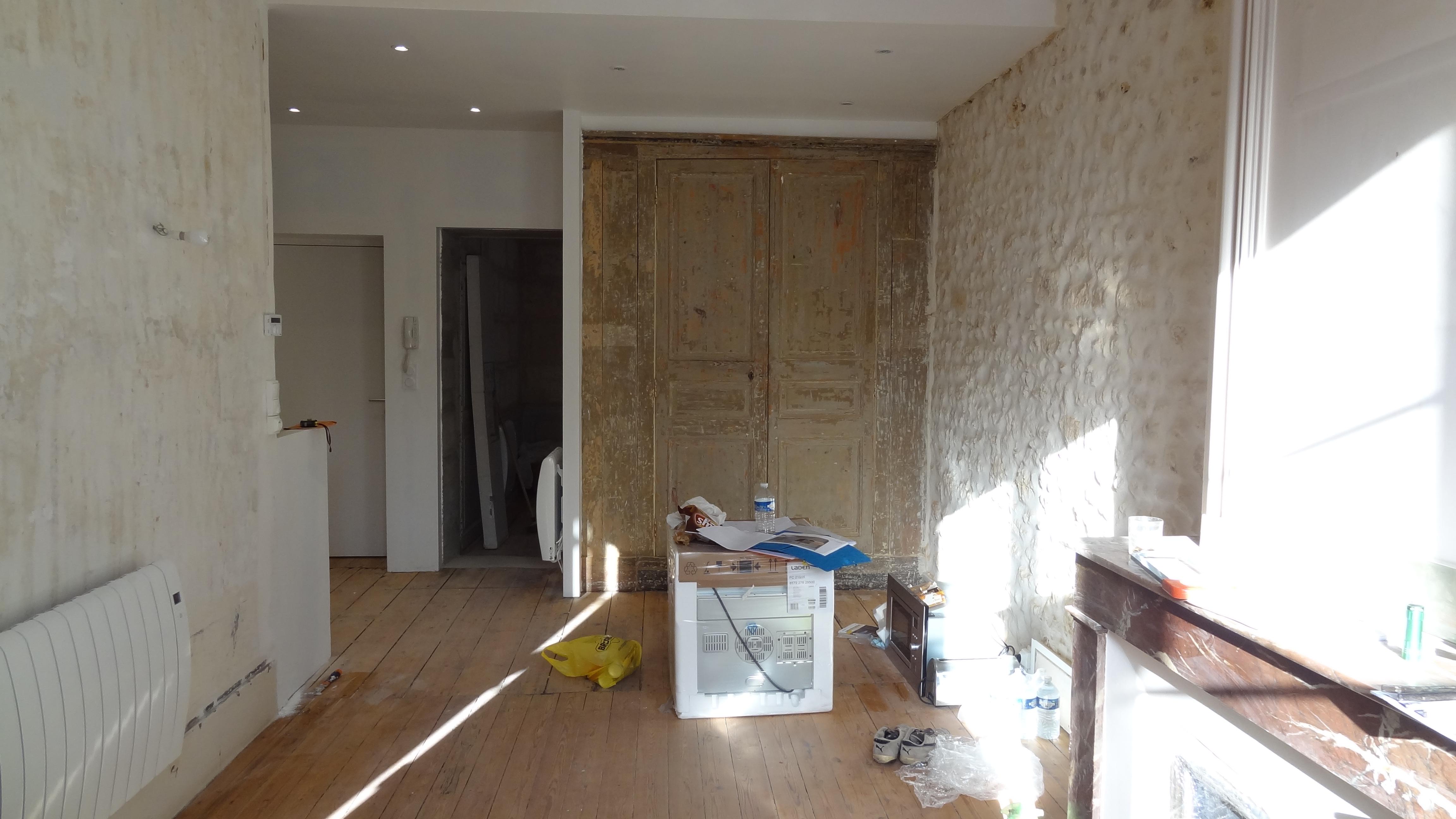 Aménagement et décoration d'un appartement ancien de 3 pièces dans un mélange de styles industriel-chic et design.