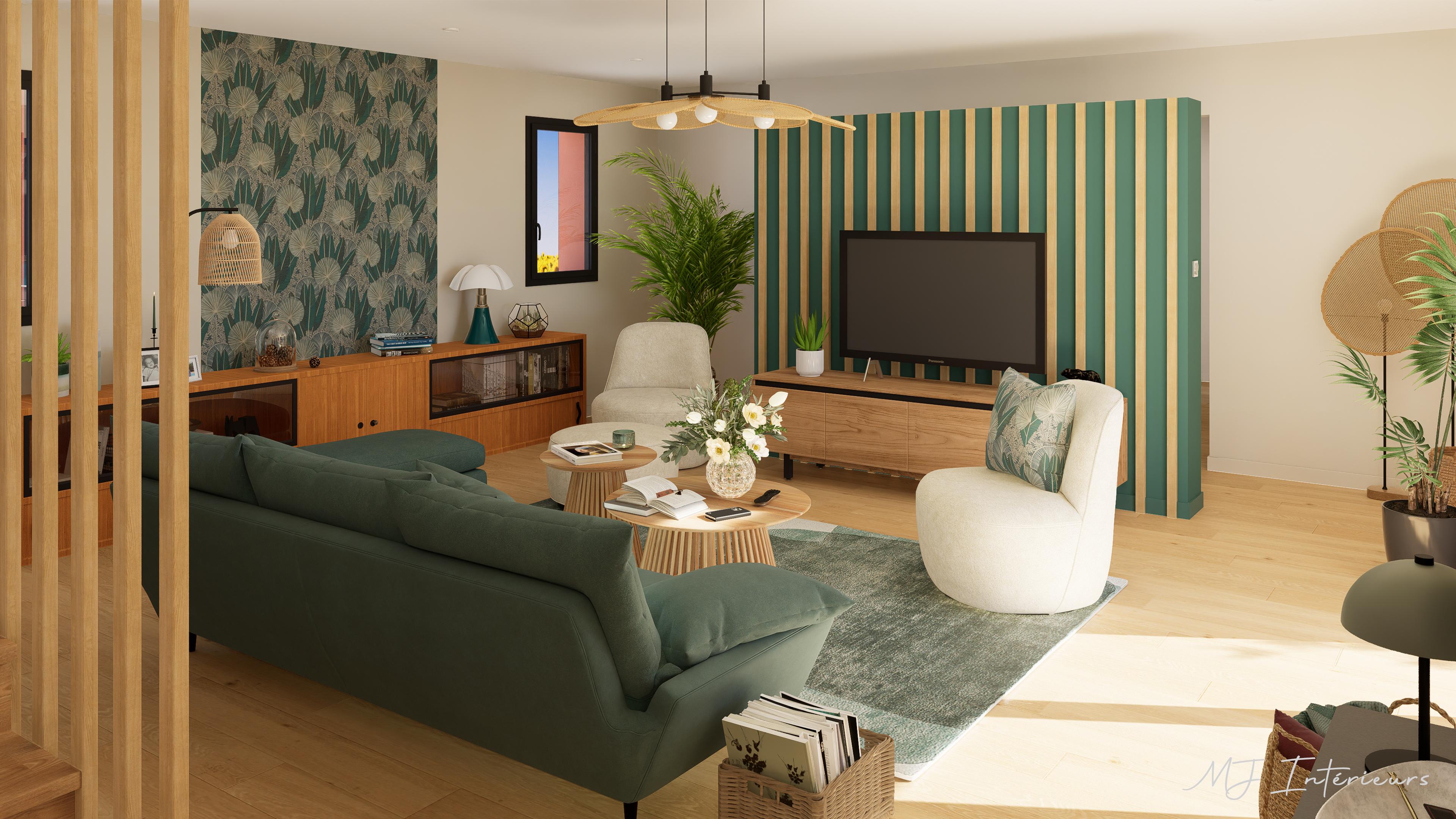 Un papier peint dans les tons vert-bleu (coup de coeur de la cliente) sera posé en 3 lés sur le mur face à la baie vitrée et une peinture dans une teinte correspondante lui répondra sur celui derrière la télé. Les autres murs seront repeints en blanc cassé.