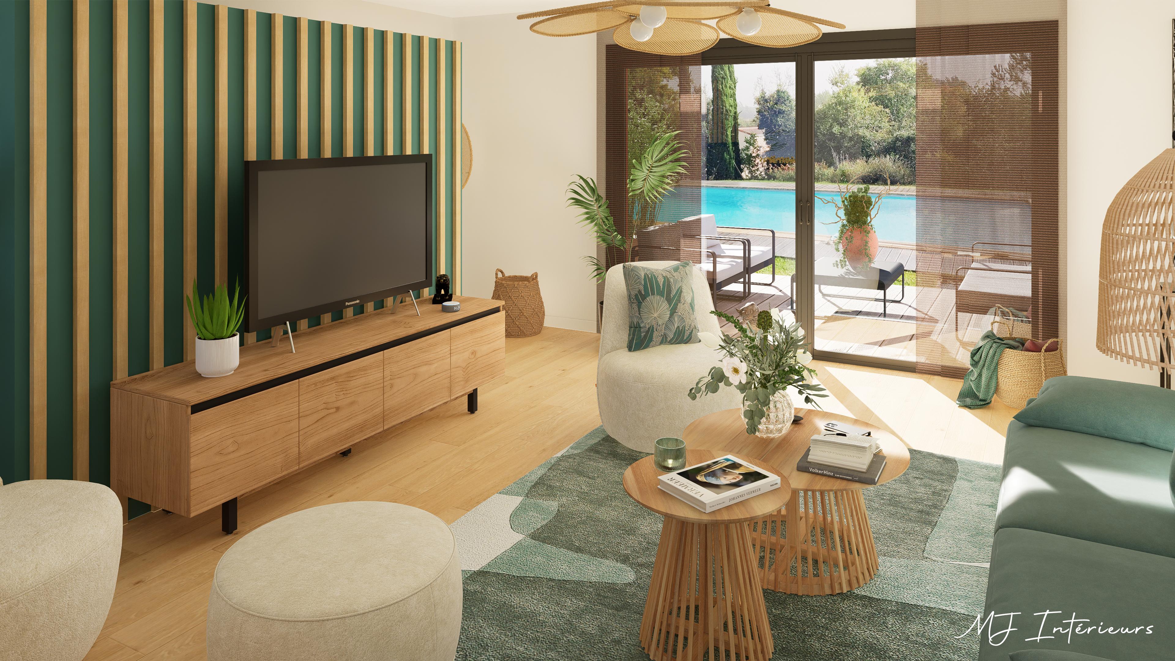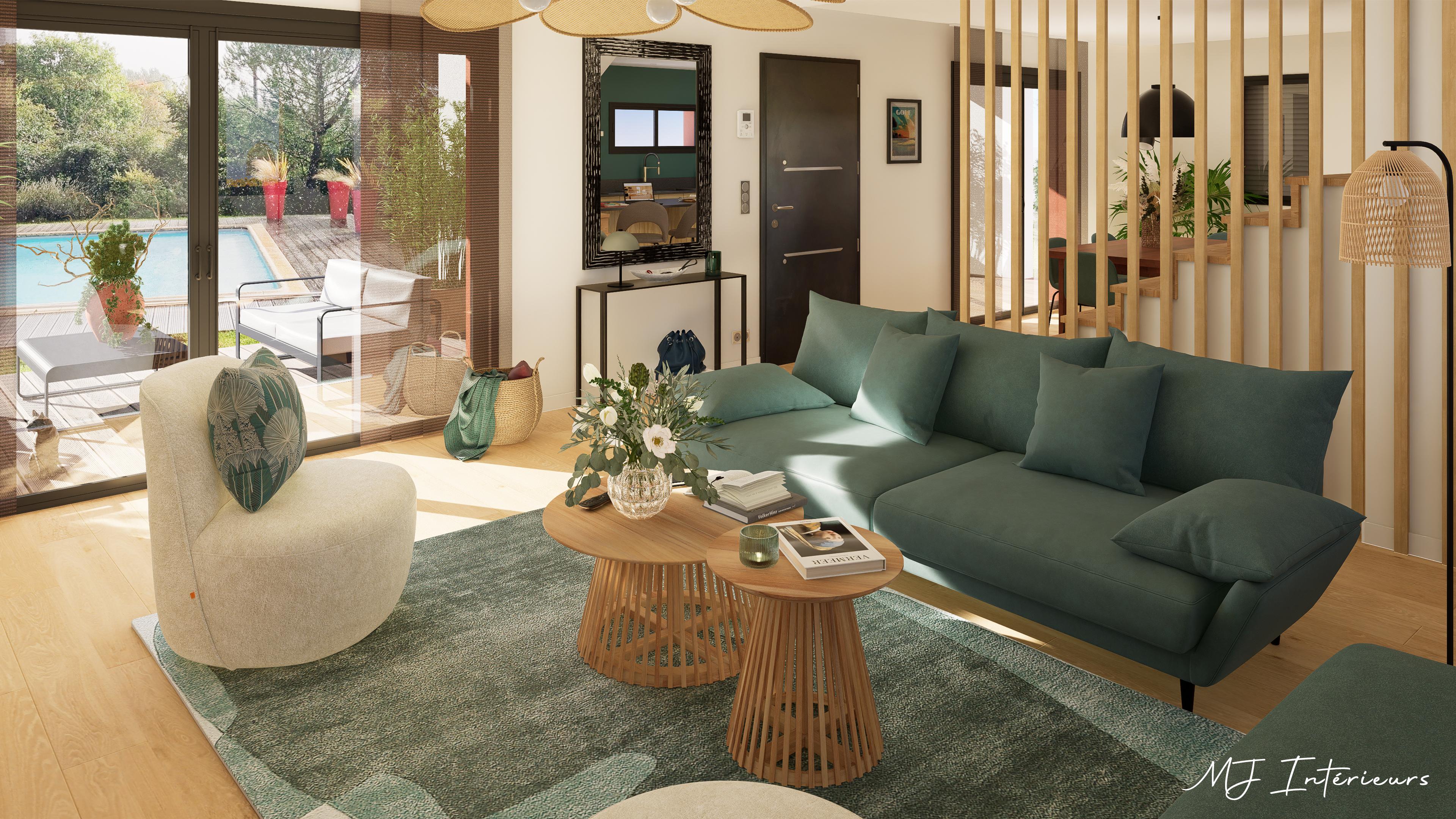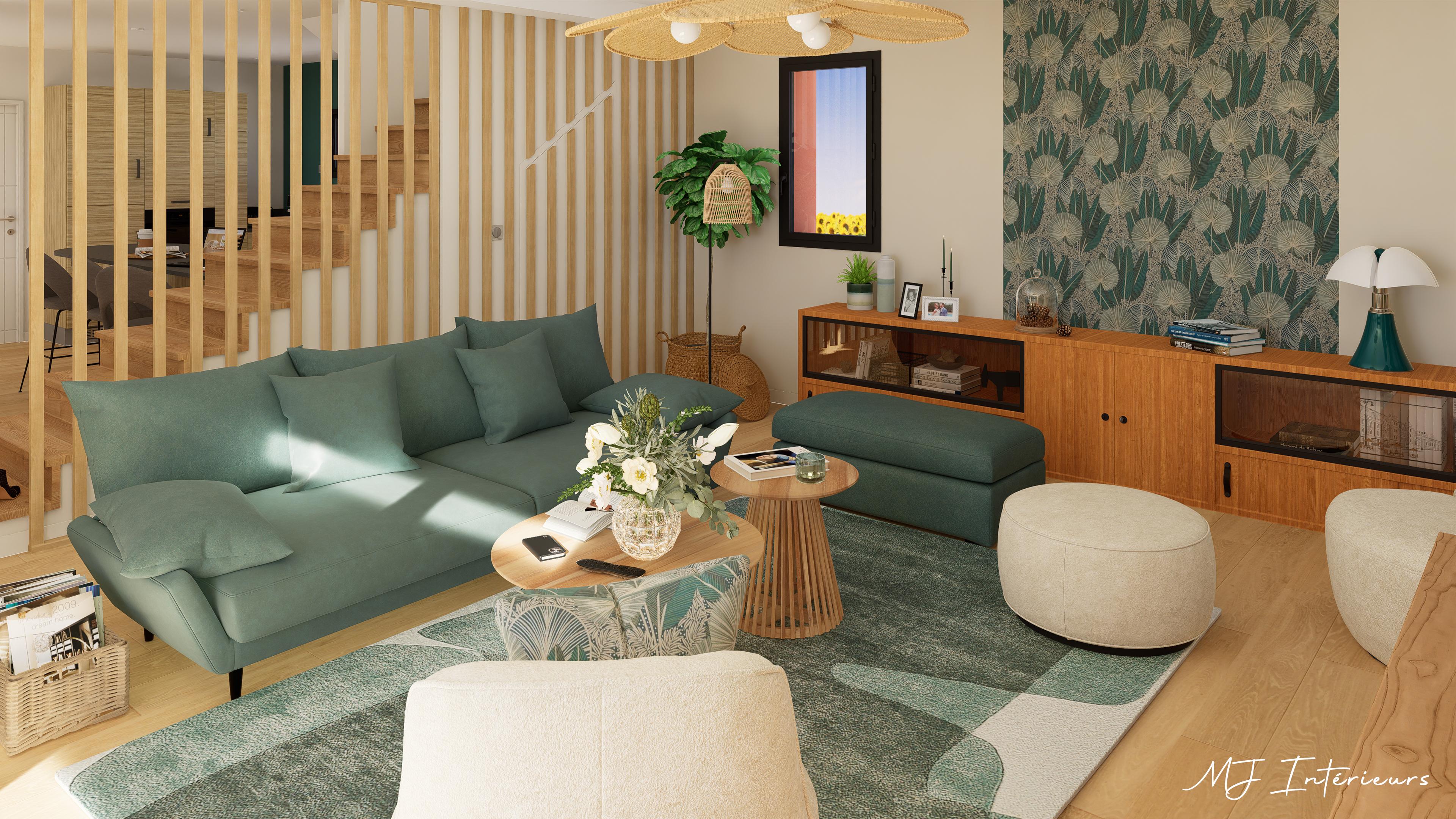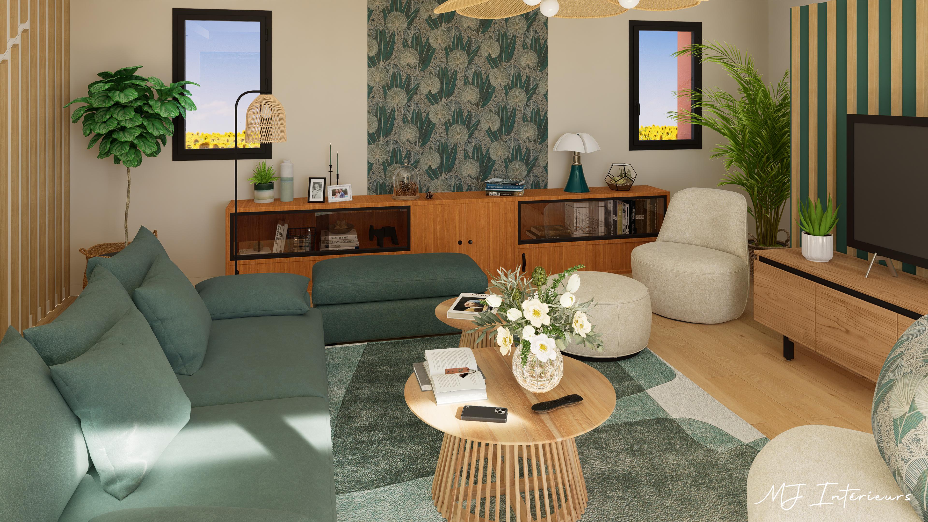 Le mobilier proposé s'harmonise avec ces éléments grâce aux teintes "vert cèdre" du canapé, les tons céladons du tapis, le piètement des tables basses rappelant les tasseaux et les essences de bois (teck et acacia) qui s'accordent avec le grand buffet bas que les clients souhaitent conserver.