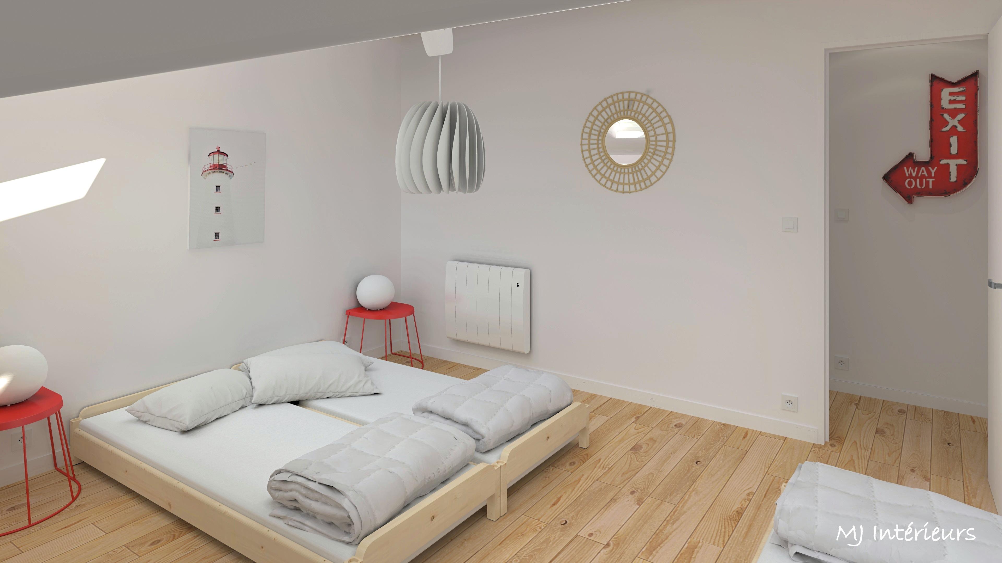 Regroupement de 2 studios de 20 m² chacun + un grenier de 40 m² en un appartement de 80 m² destiné à la location saisonnière. L'agencement est pensé pour accueillir 6 personnes (+ 2 au salon occasionnellement) avec une chambre parentale confortable et un dortoir modulable grâce à des lits empilables qui peuvent être déplacés facilement.