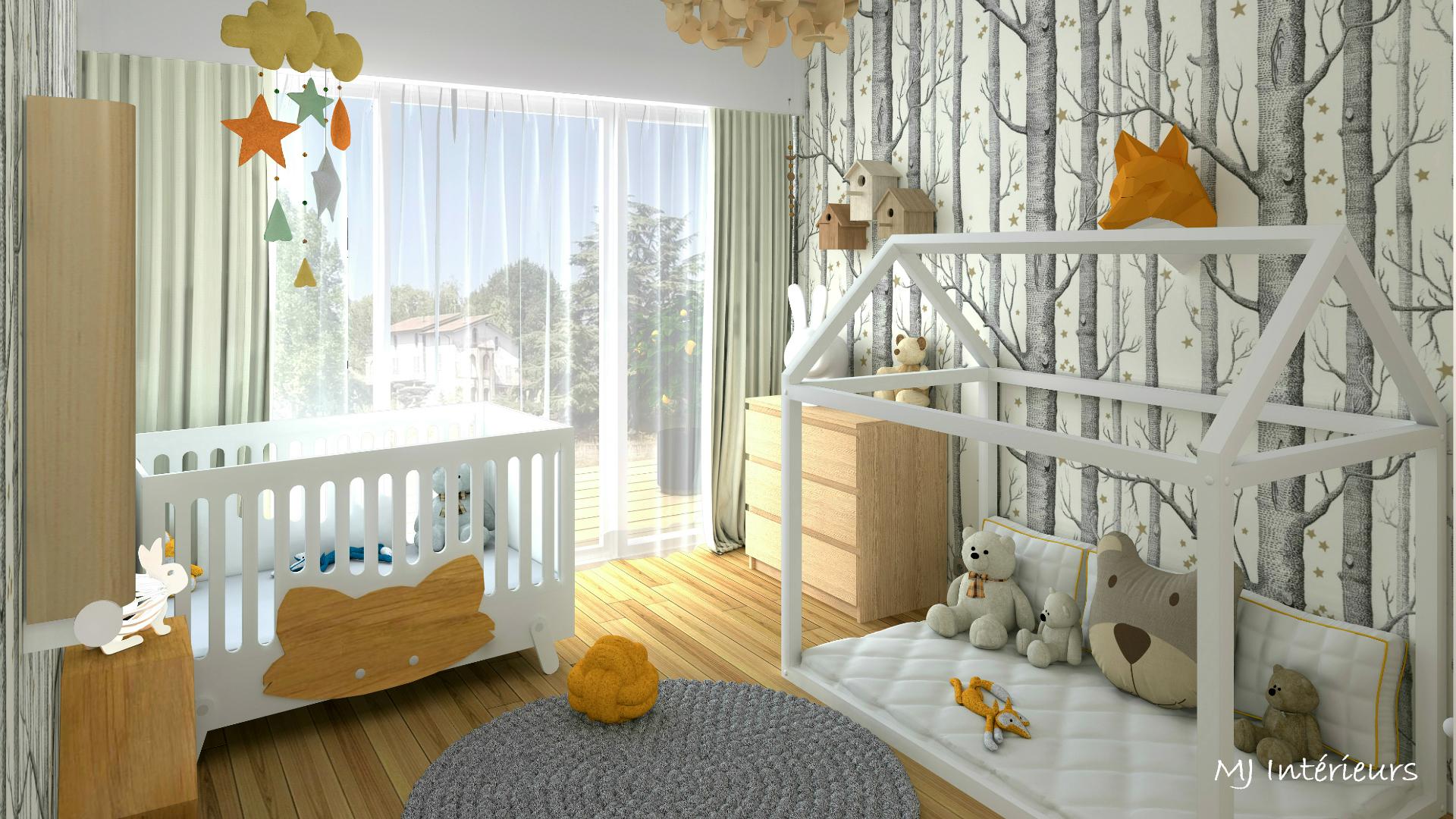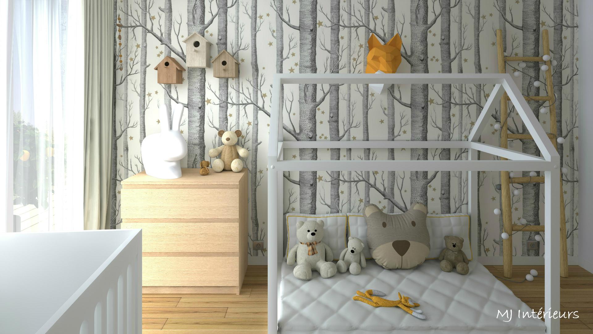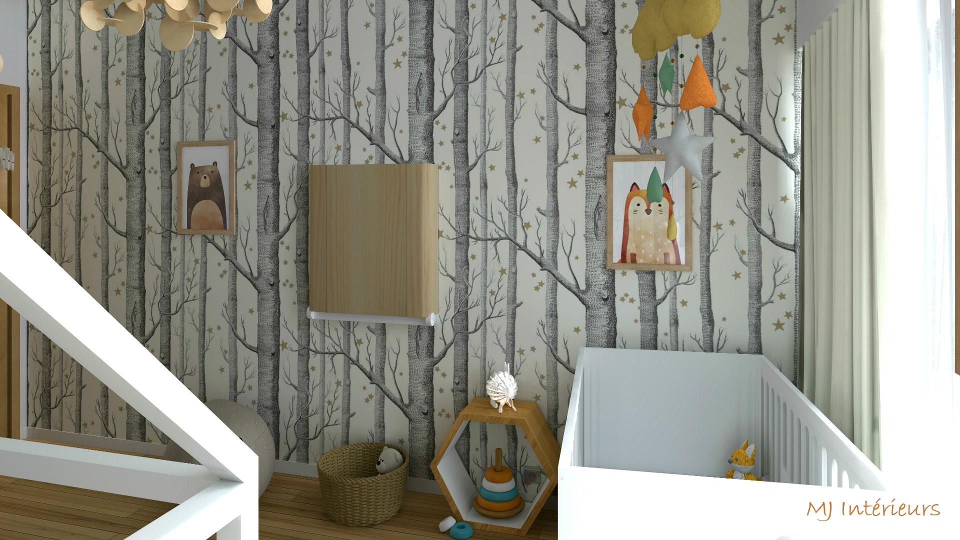 Ses parents ayant eu un coup de coeur pour le papier peint "Woods and stars" (Cole and Son), le thème de la forêt et ses animaux est décliné dans des tons naturels.
