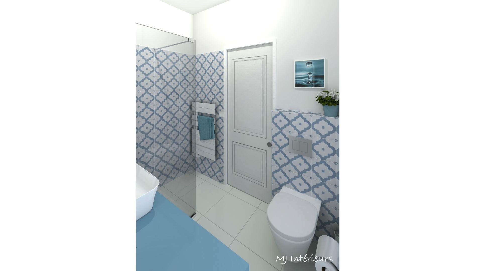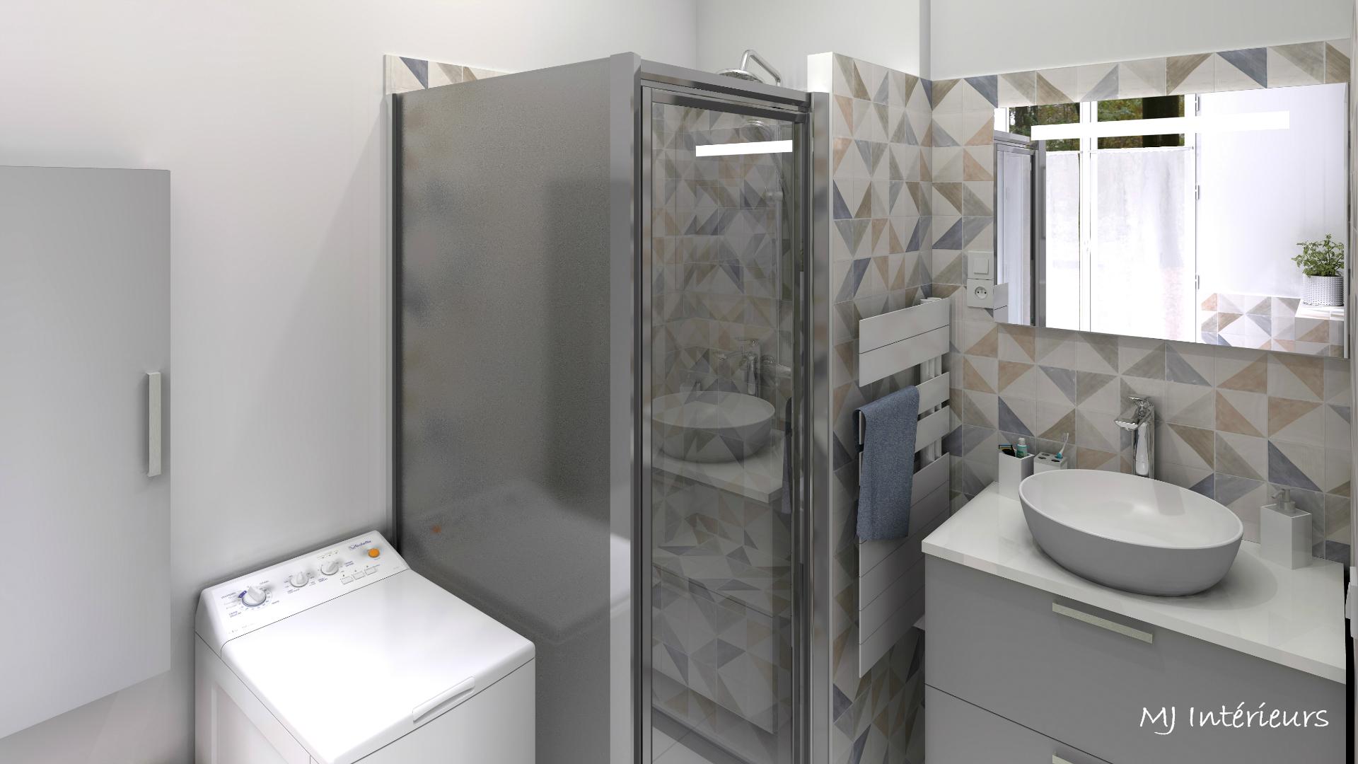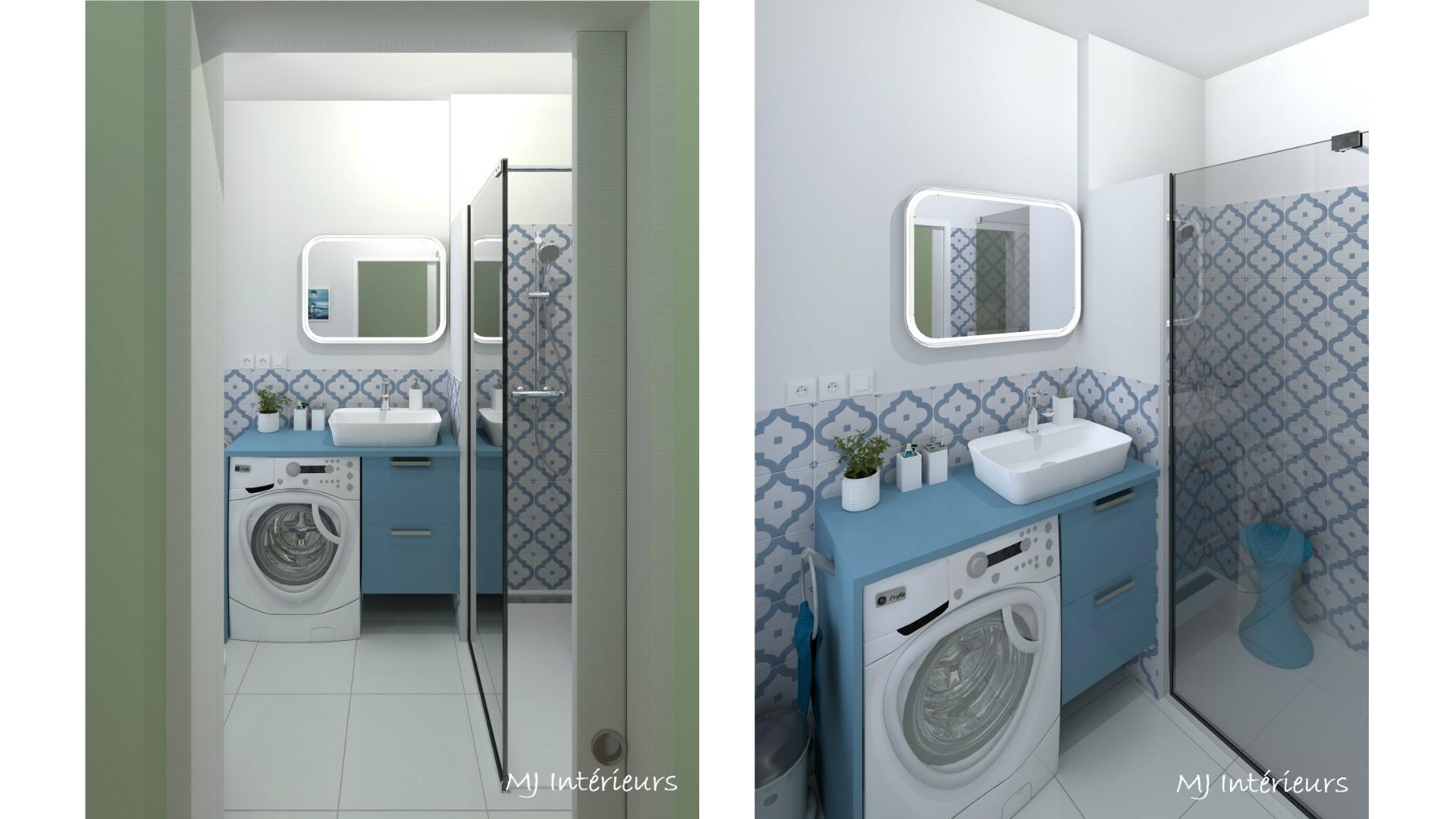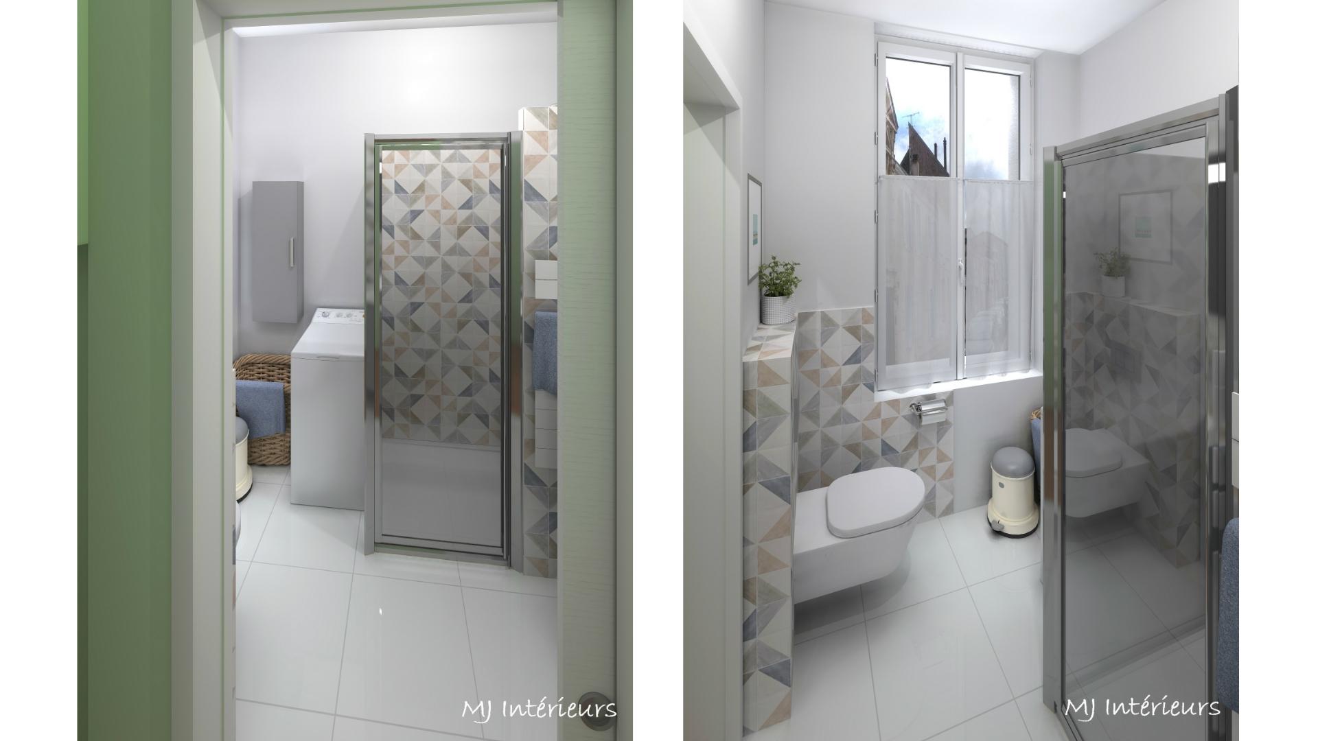 Rénovation de la salle de bain avec modification de l'accès et remplacement de la baignoire par une douche (2 versions proposées).