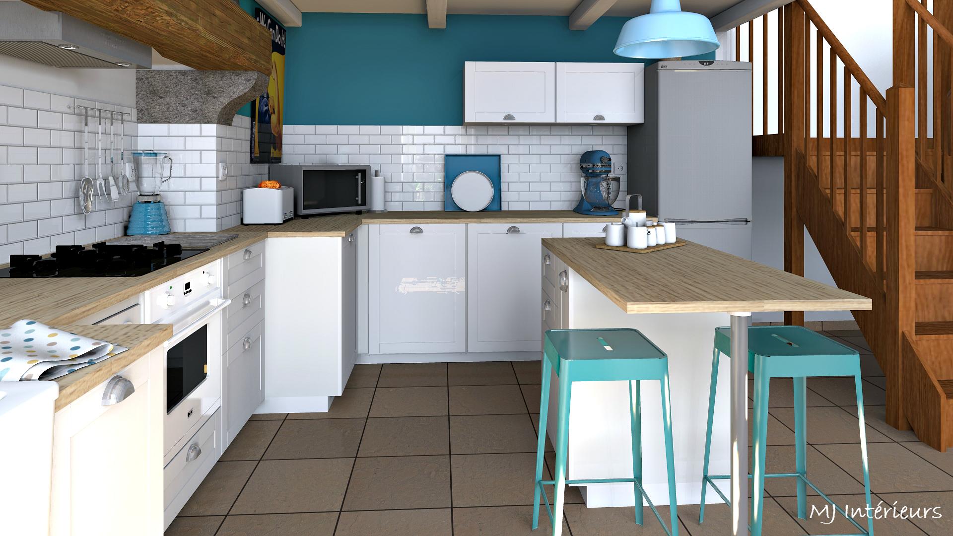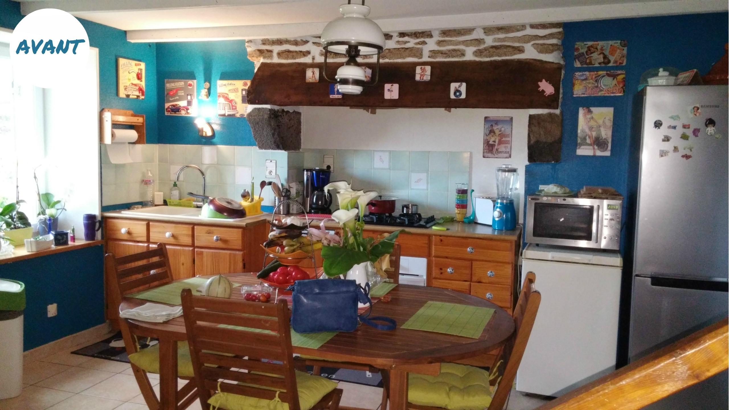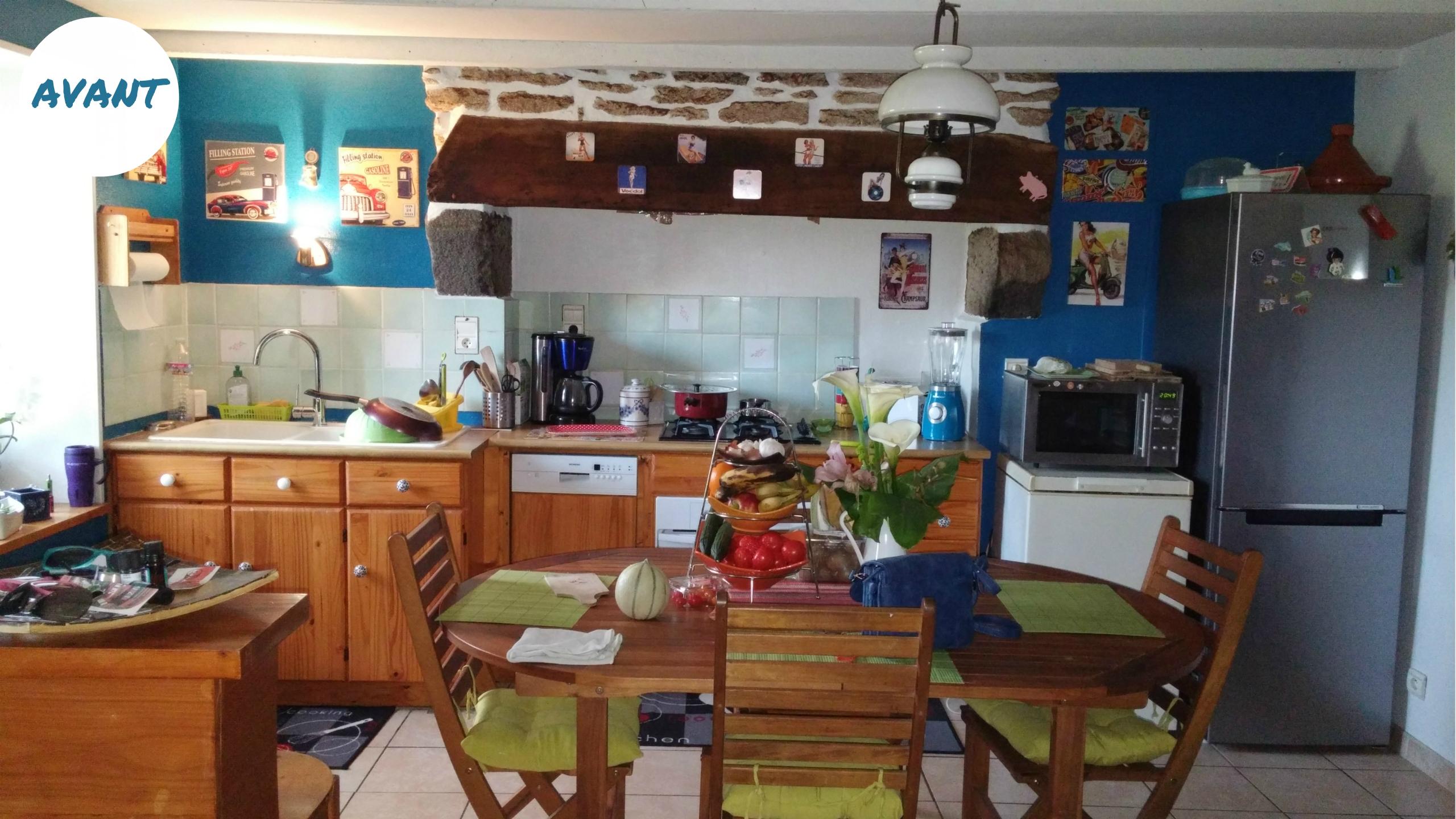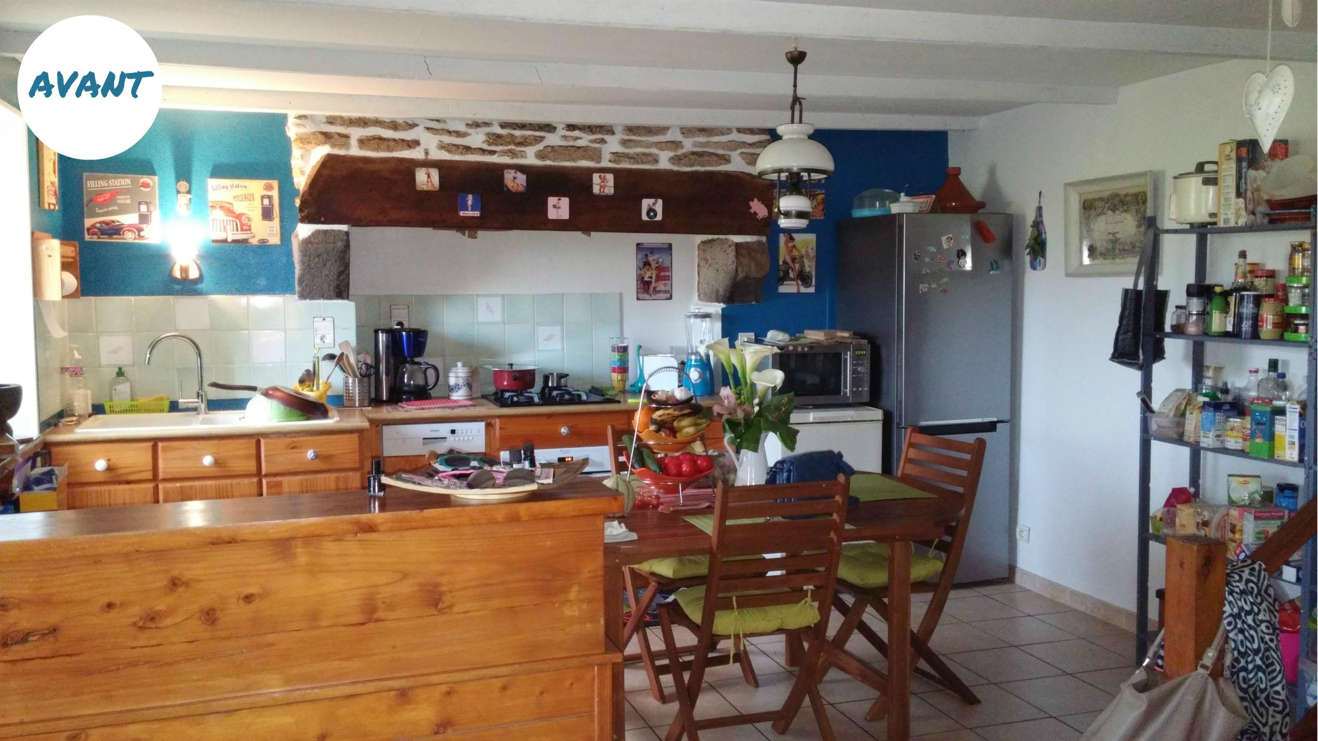 Remplacement d'une cuisine en pin un peu vieillotte et incomplète par un modèle plus fonctionnel avec des façades blanches et un plan de travail en bois clair.