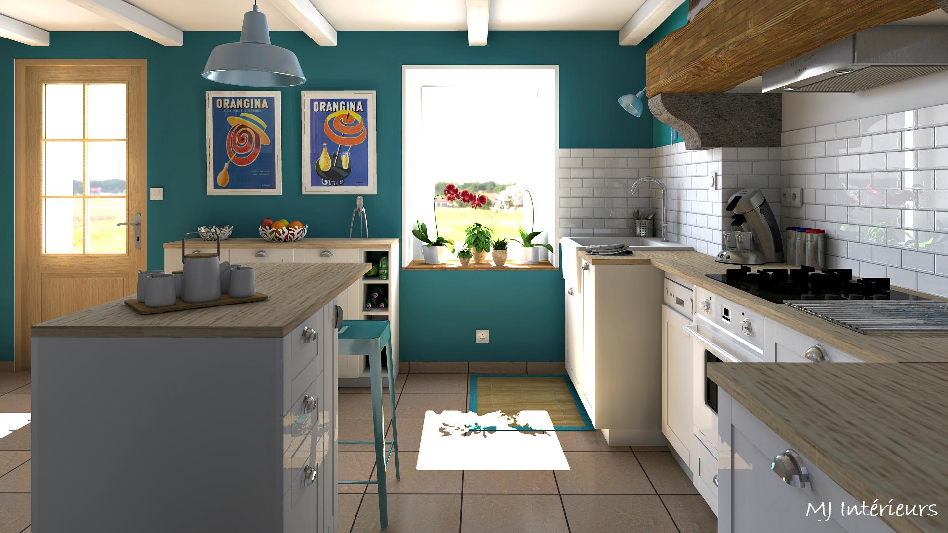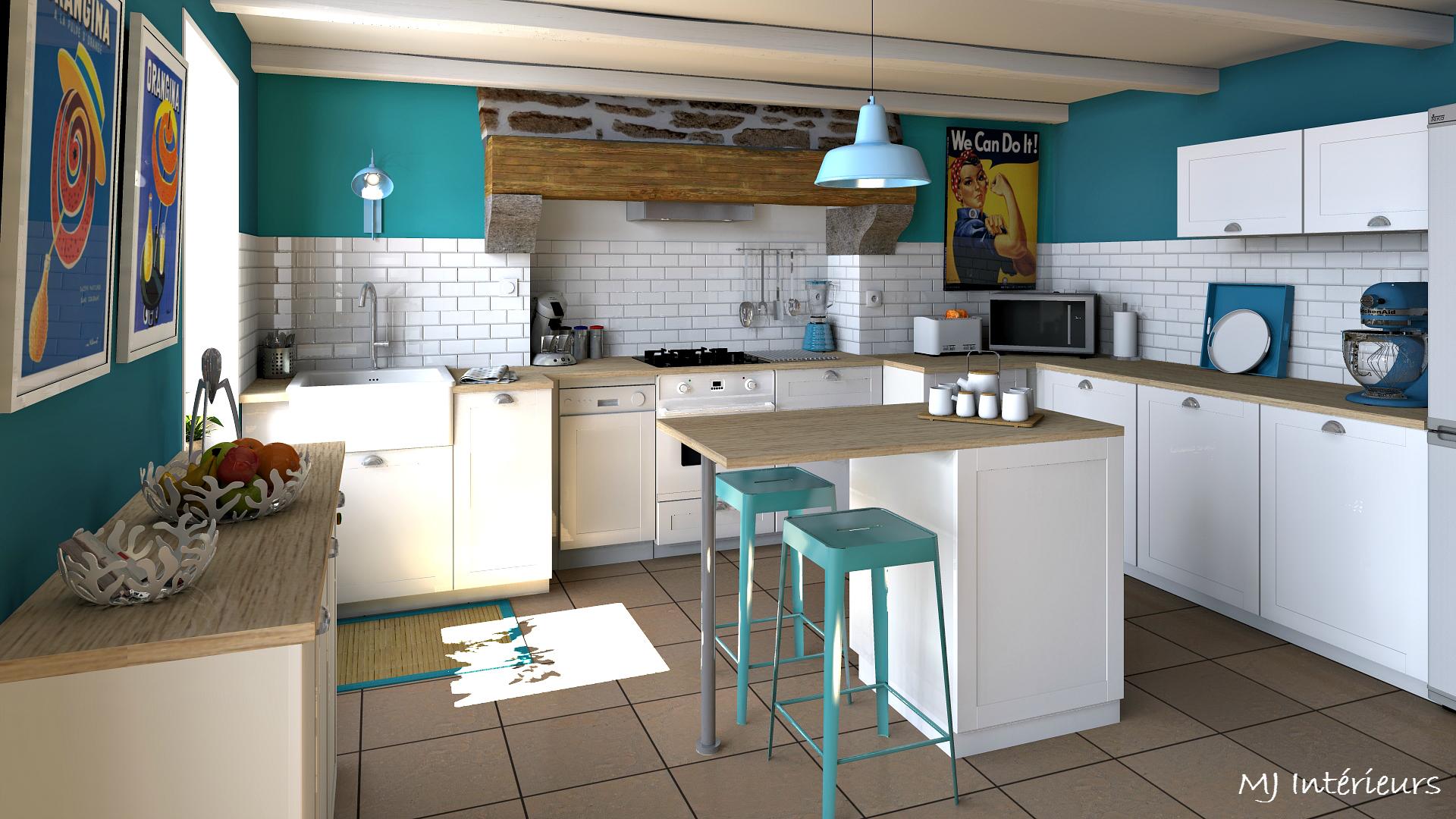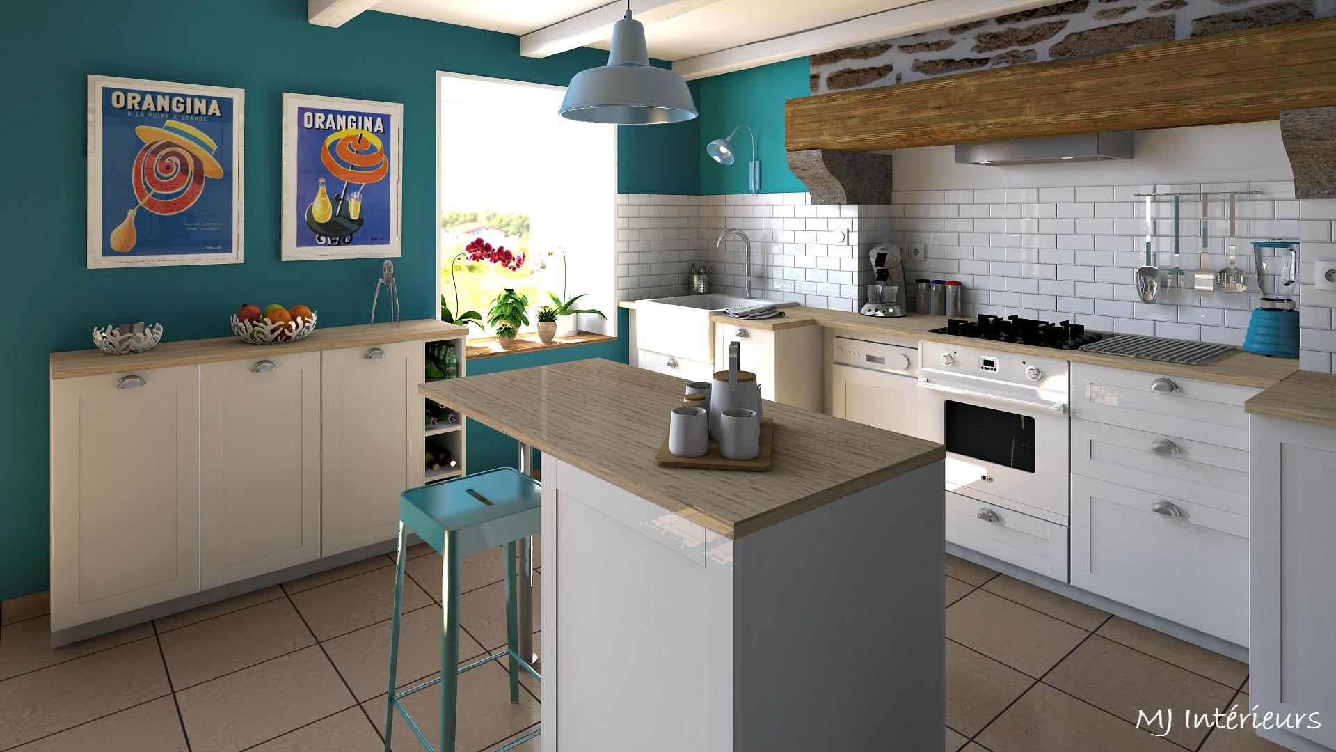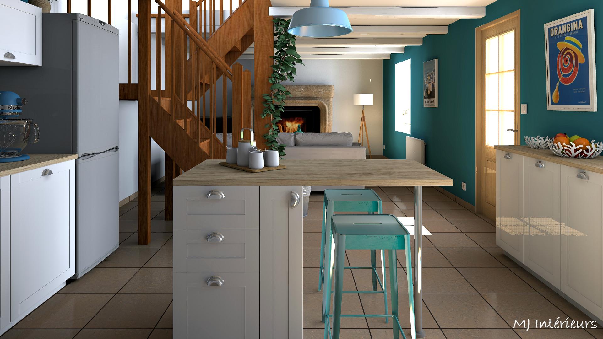 Remplacement d'une cuisine en pin un peu vieillotte et incomplète par un modèle plus fonctionnel avec des façades blanches et un plan de travail en bois clair.
