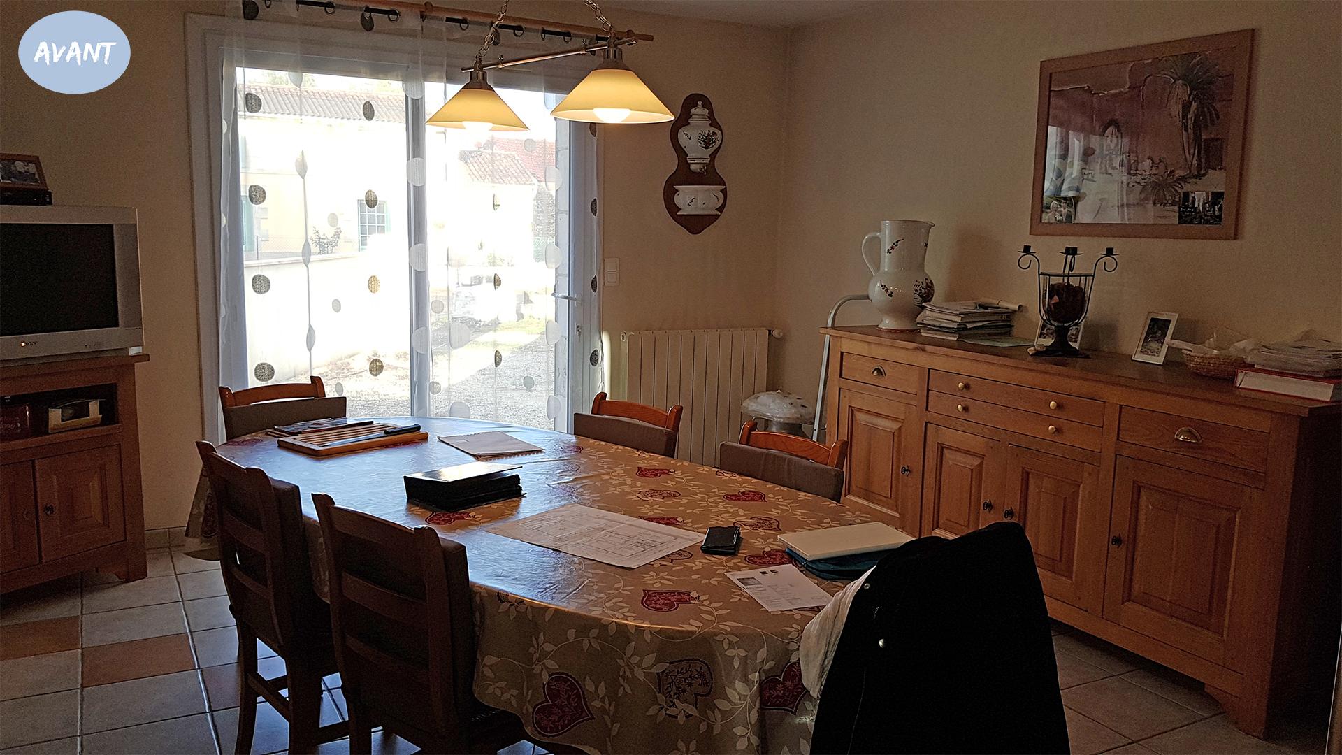 Dans la salle à manger, la cheminée est remplacée par un poêle à bois et de nouveaux meubles (table, chaises, console, petits fauteuils) sont proposés en veillant à ce qu'ils s'accordent avec le buffet ancien de famille.