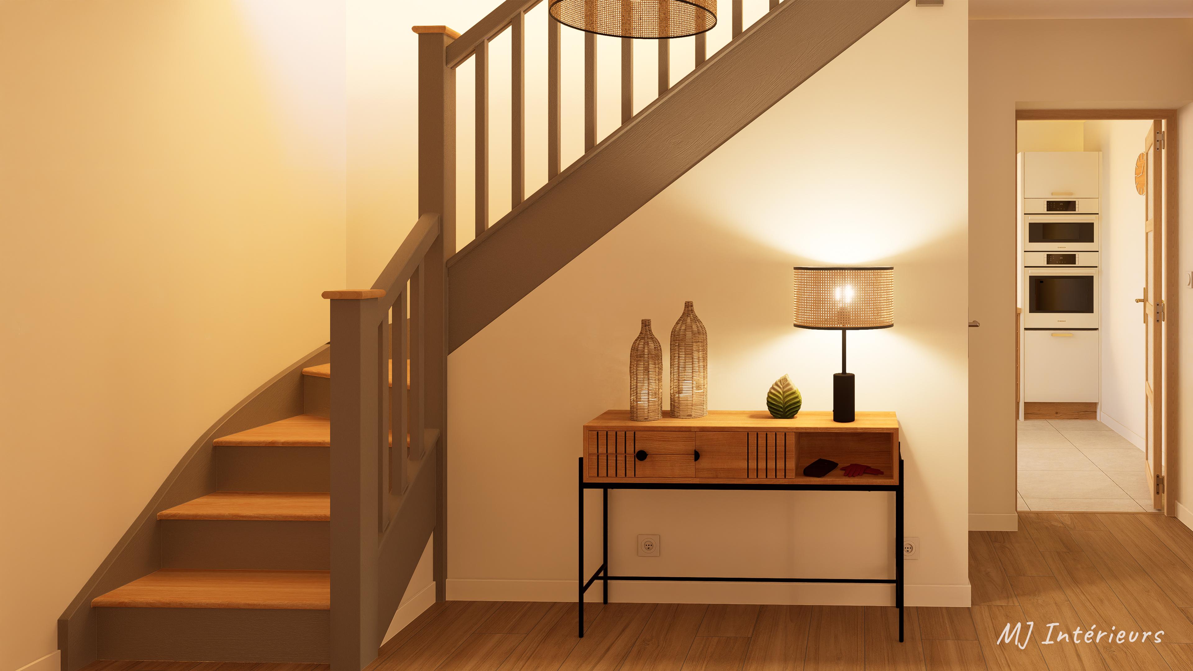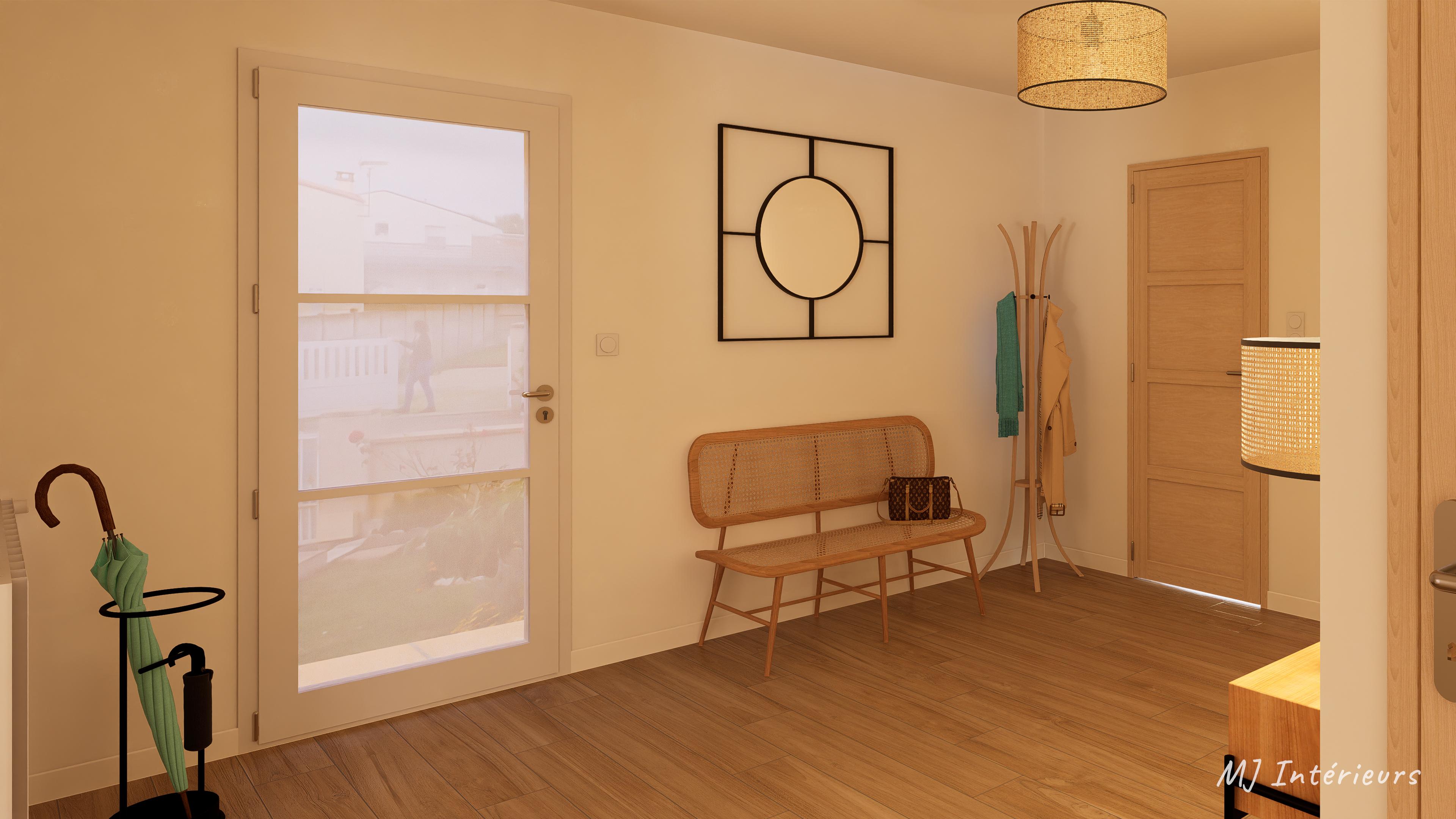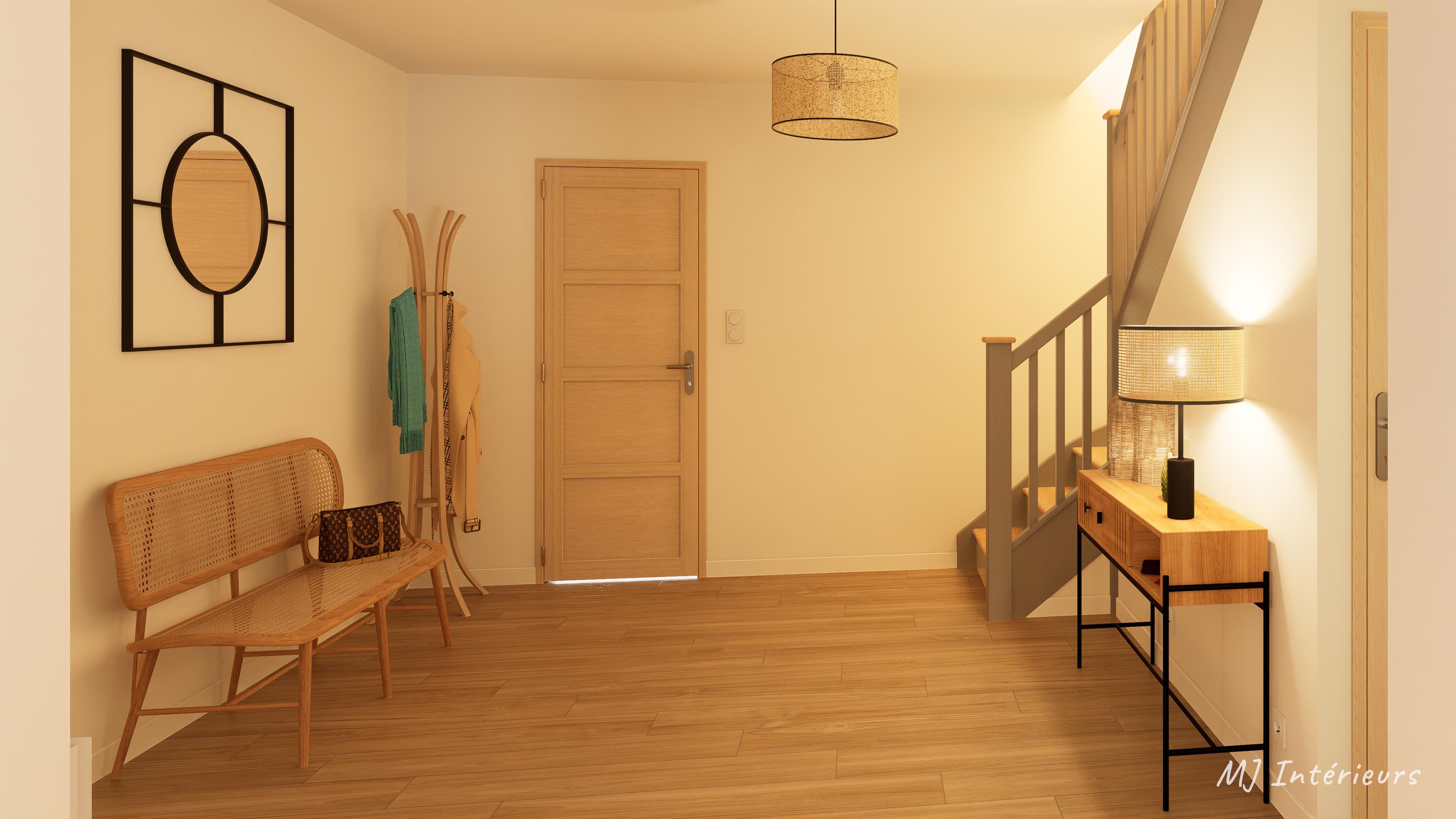 Pour l'entrée, j'ai également proposé du mobilier (un banc, une console et un porte-manteaux) ainsi que des luminaires.