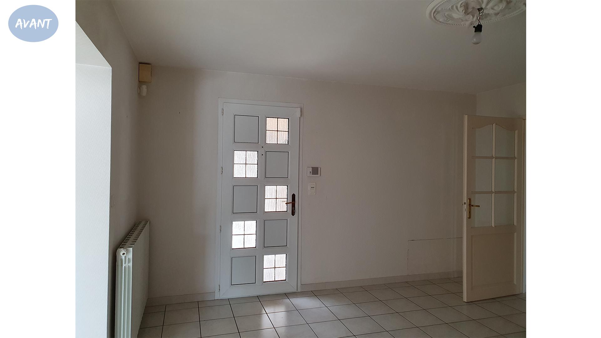 La porte d'entrée en PVC trop occultante sera changée pour un modèle en aluminium avec grand vitrage dépoli pour plus de luminosité et de nouvelles portes intérieures en hêtre (et verre givré pour certaines) seront posées.