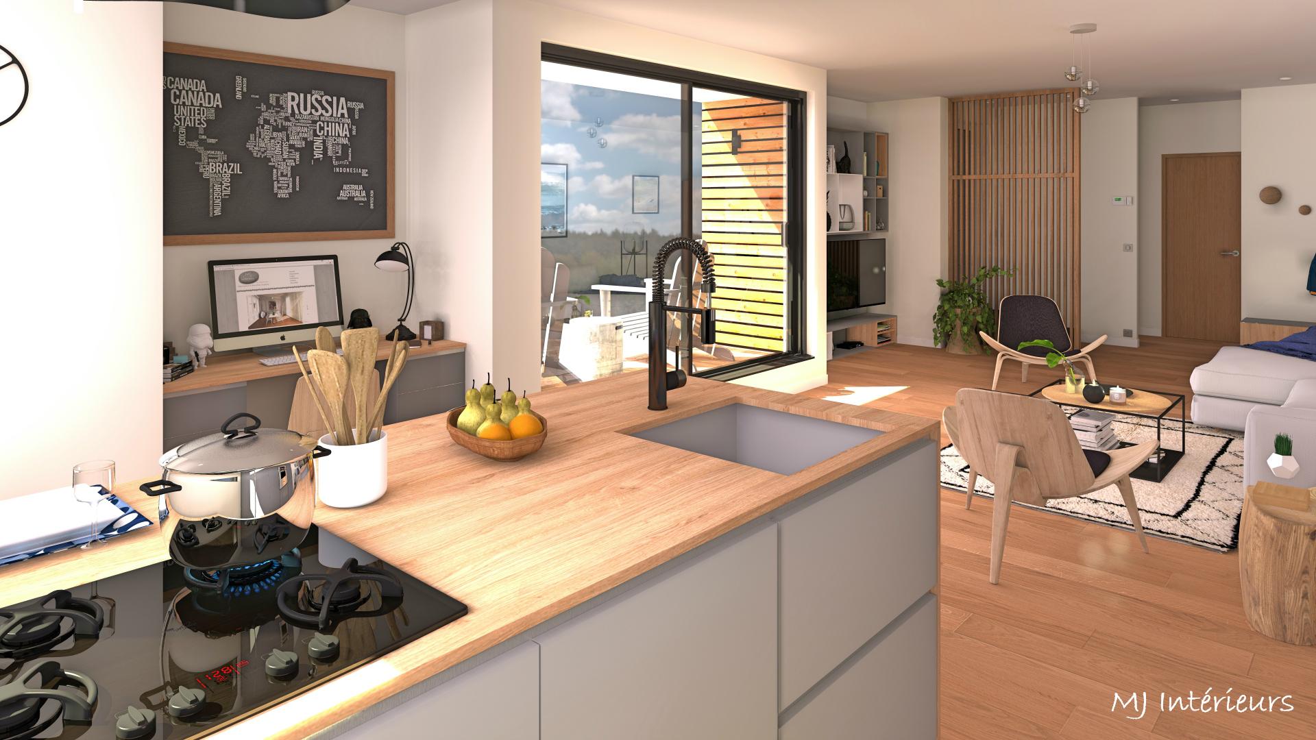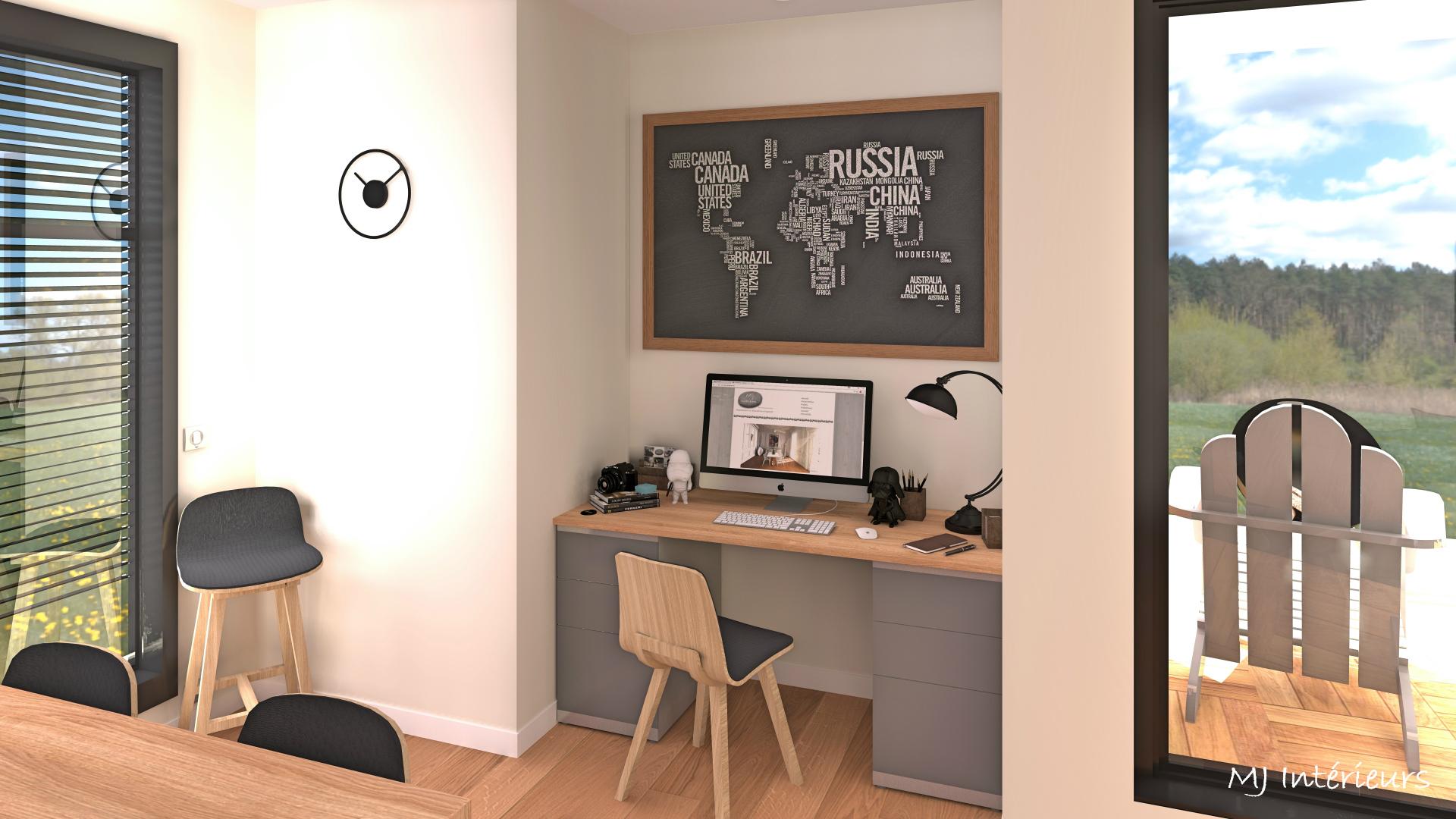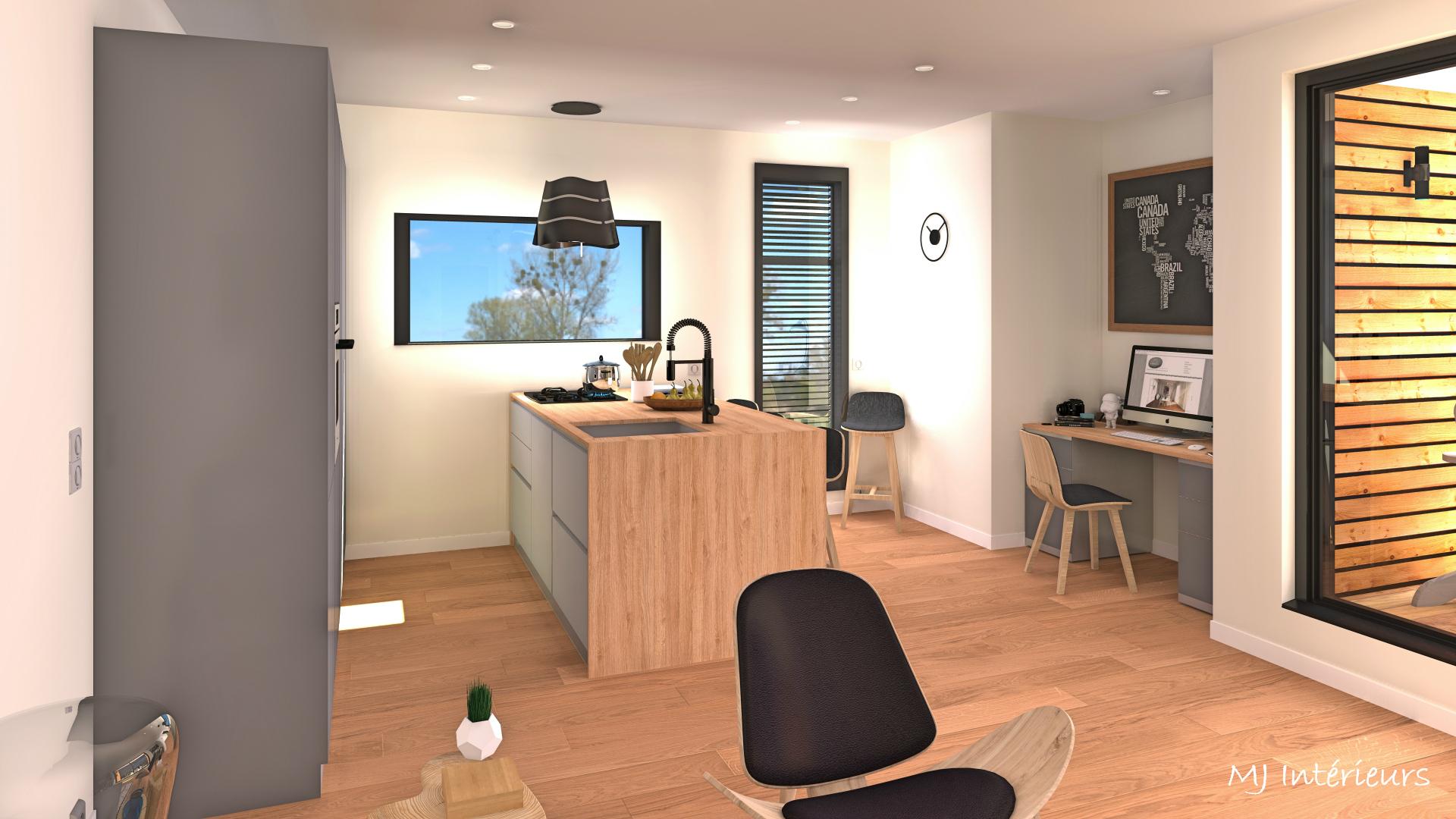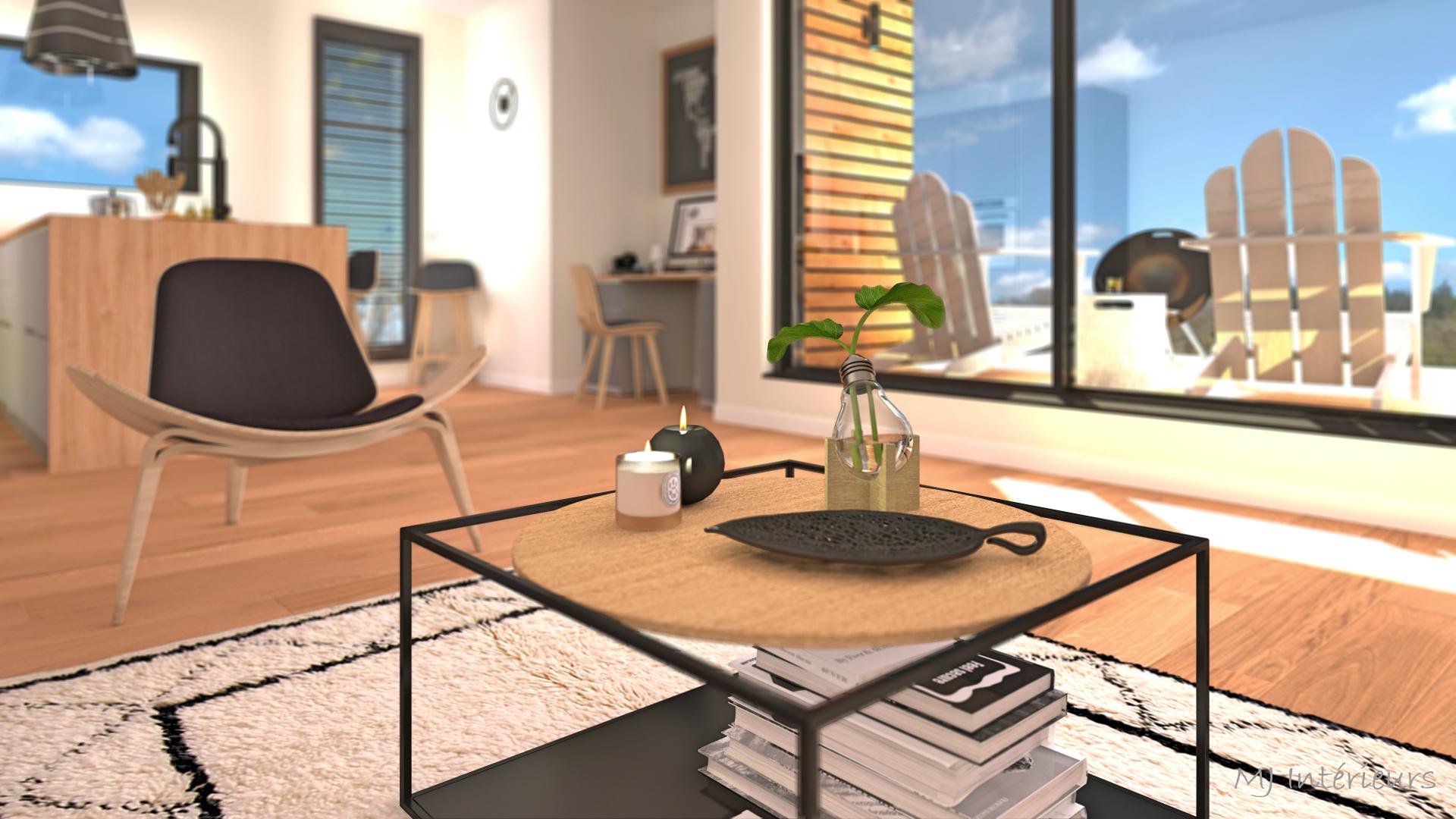A partir de plans, agencement et décoration d'une maison en bois en construction dans un style contemporain et une ambiance masculine pour un jeune couple sans enfant.