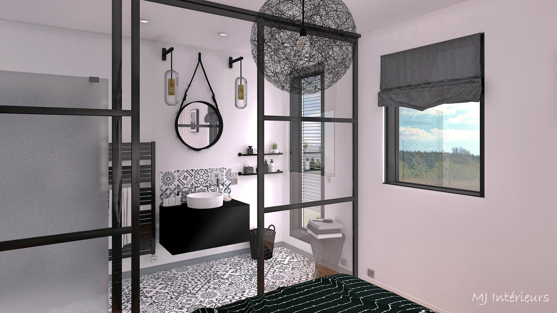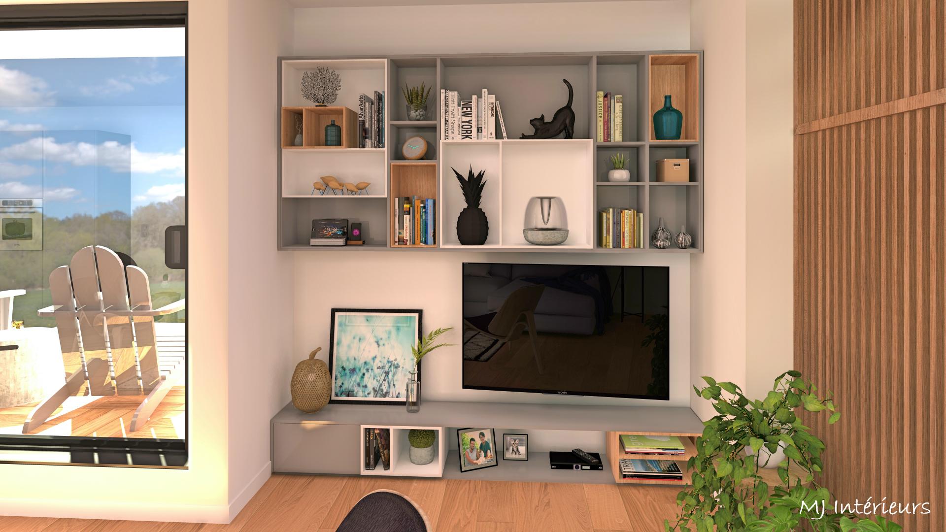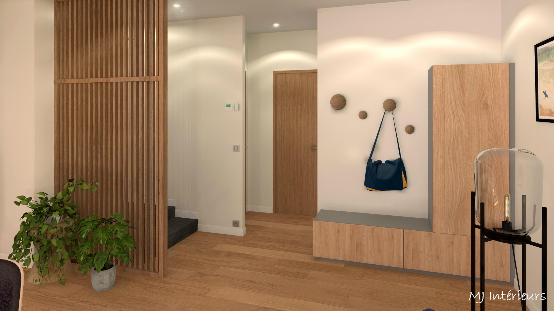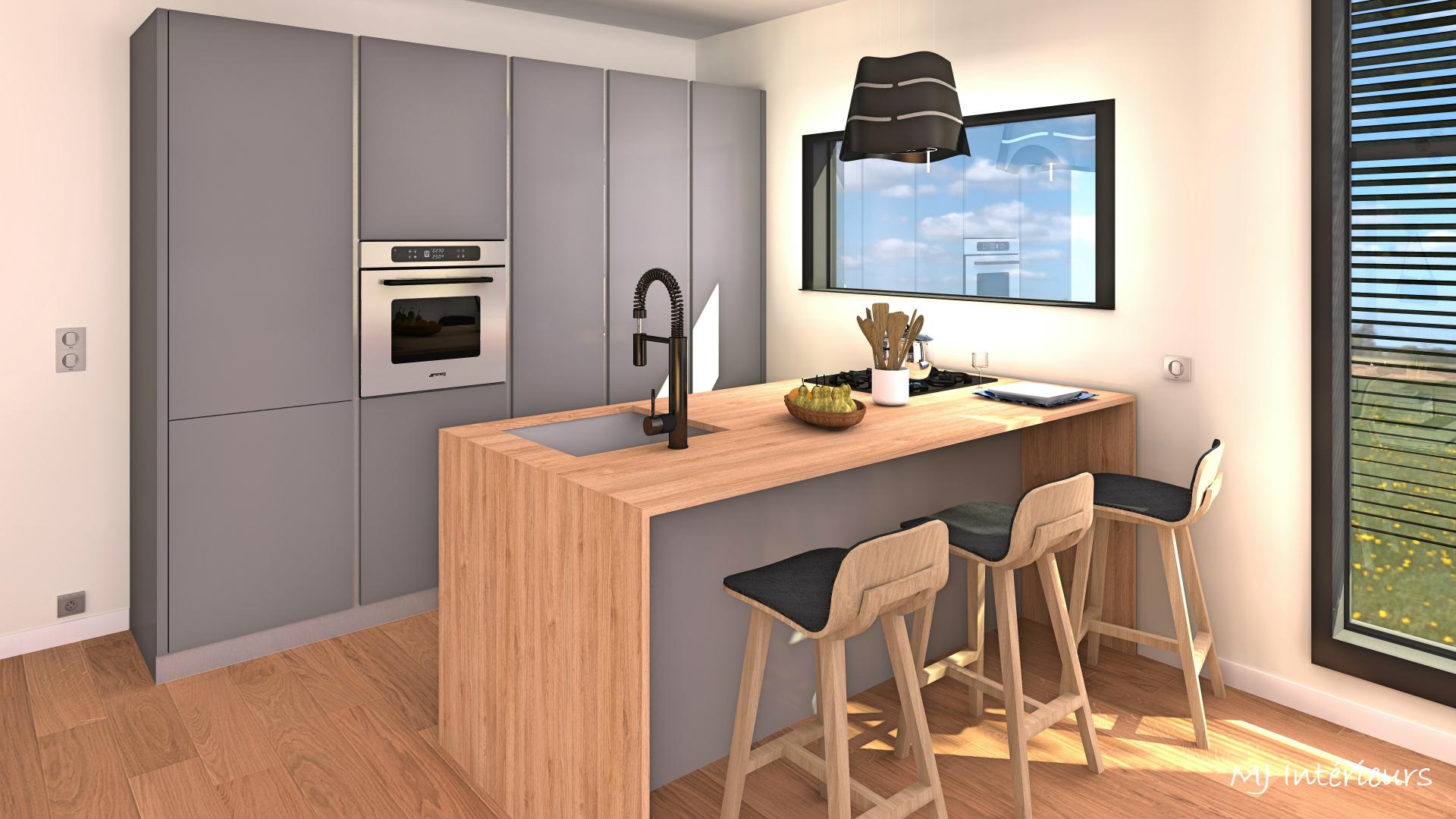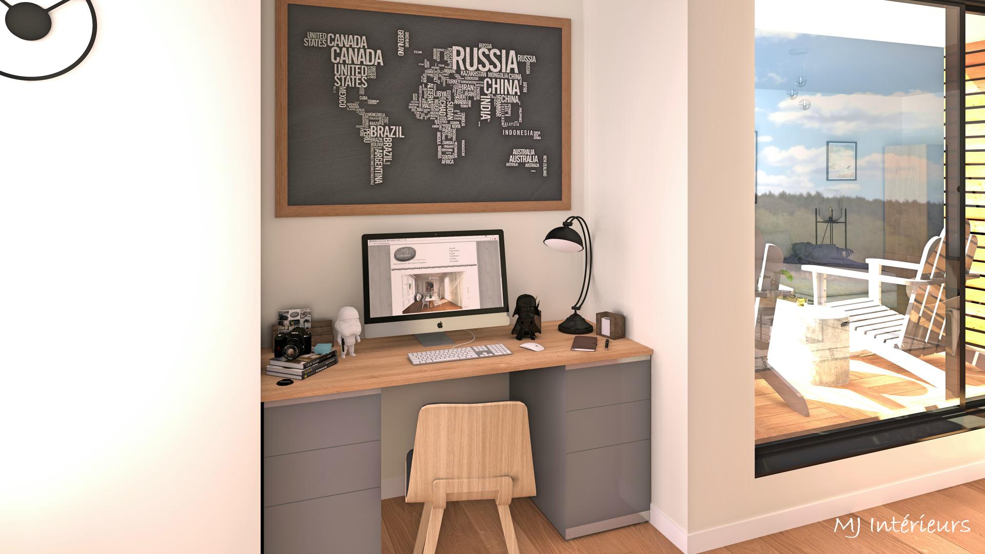 A partir de plans, agencement et décoration d'une maison en bois en construction dans un style contemporain et une ambiance masculine pour un jeune couple sans enfant.