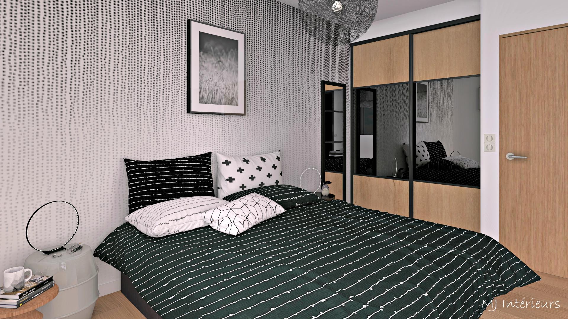 Des tons neutres au salon (gris, ivoire, noir) et du black & white dans la chambre, le tout réchauffé par le bois.