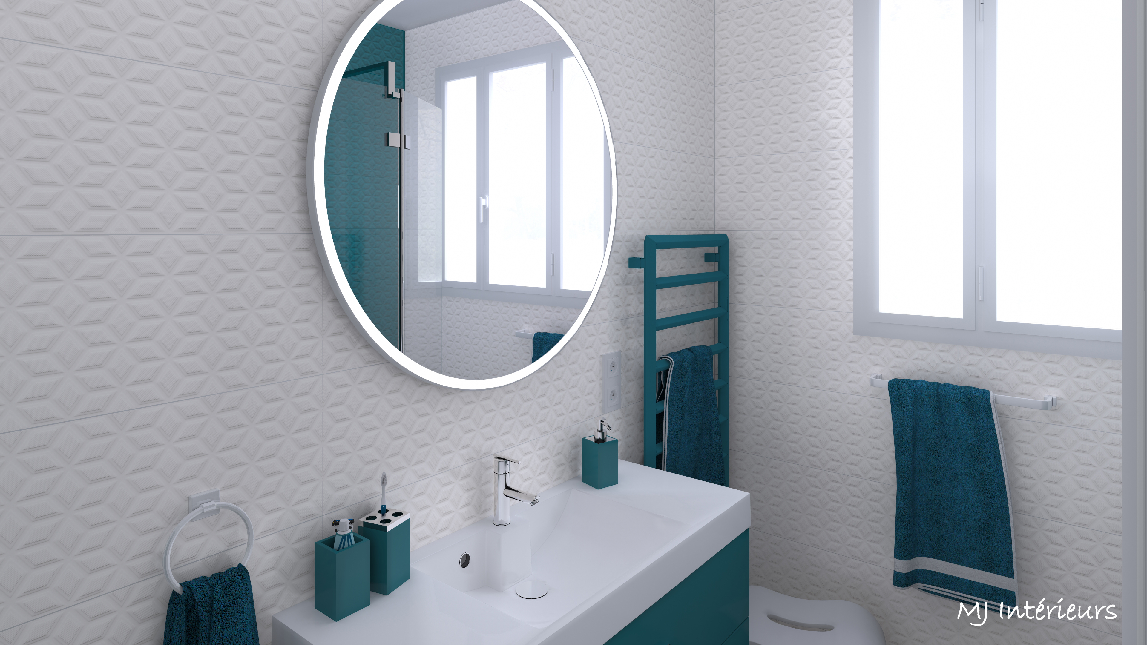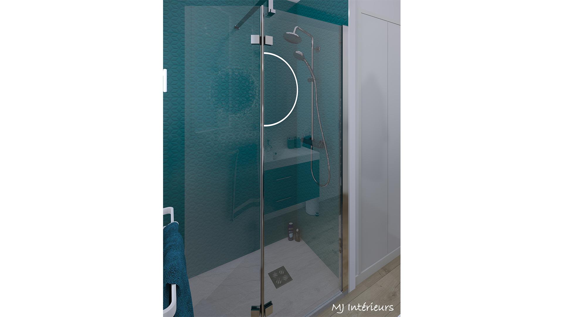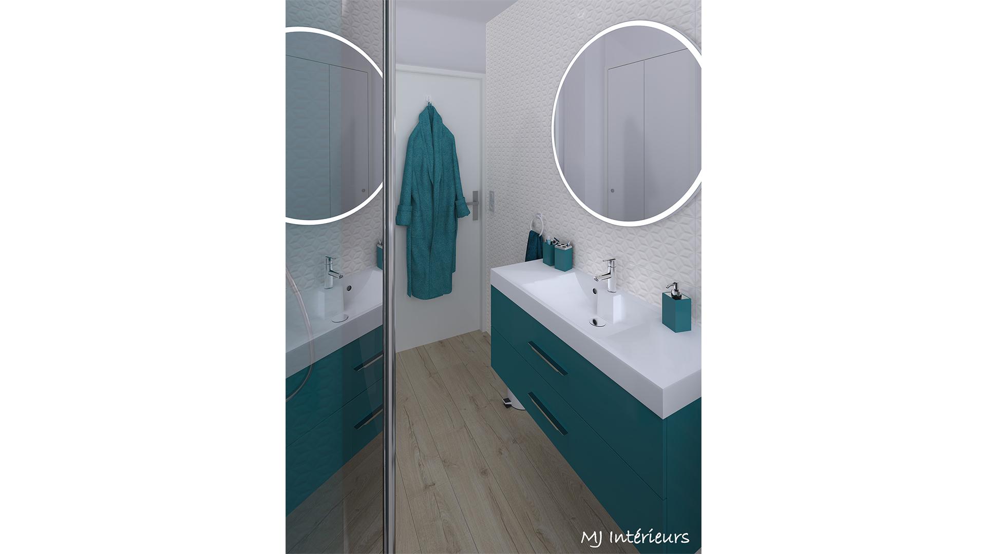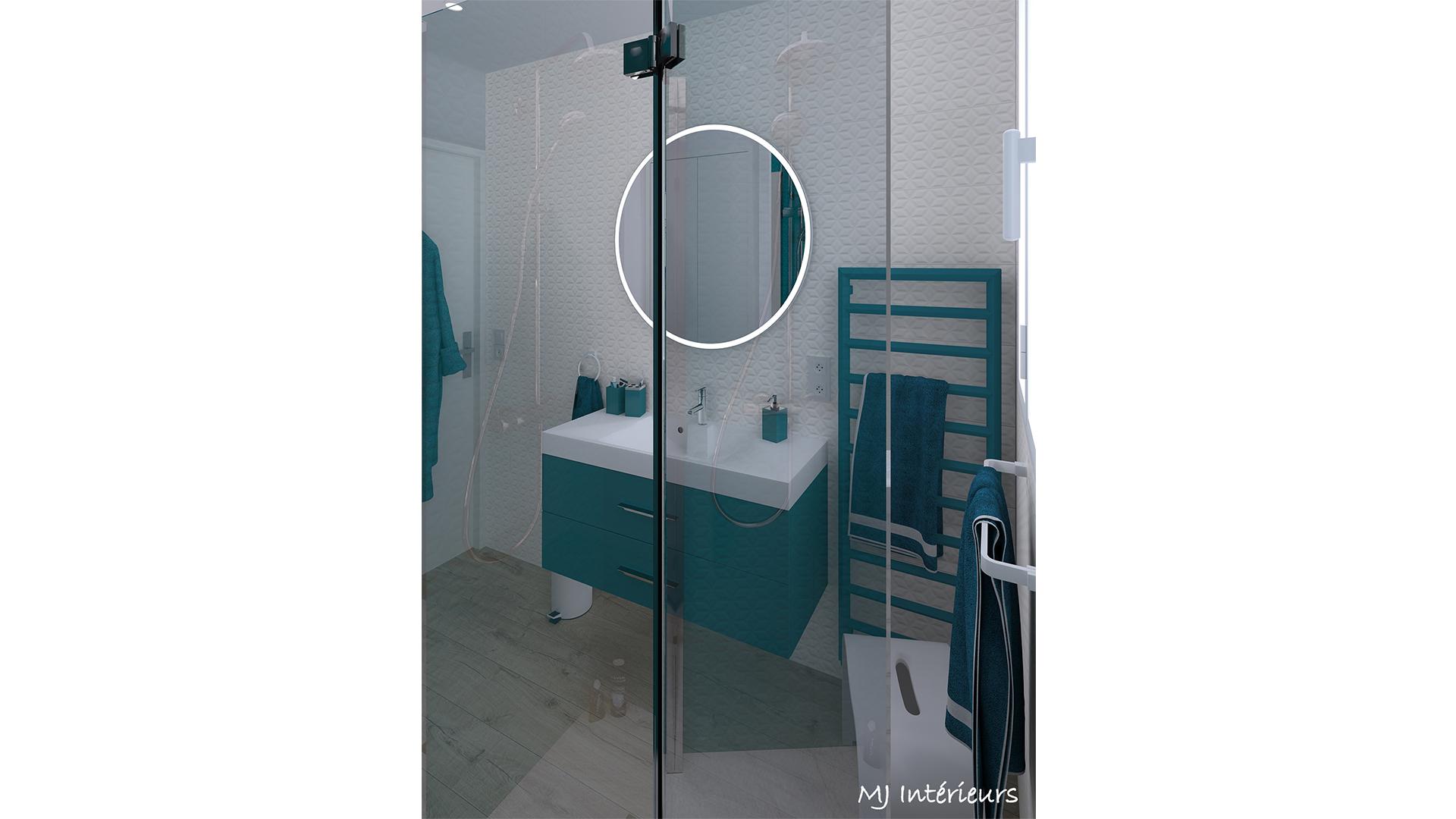 Le nouveau meuble vasque laqué bleu canard s'harmonise avec la faïence murale de la douche ainsi que le radiateur sèche-serviette.