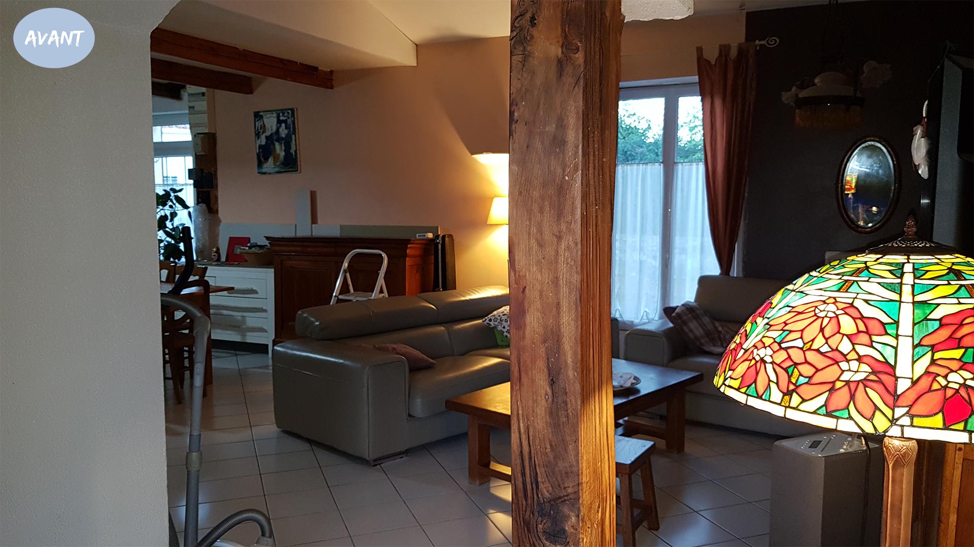 Remplacement du carrelage de sol blanc un peu froid, modification du passage vers le dégagement (suppression des arches et de la grosse poutre rustique).