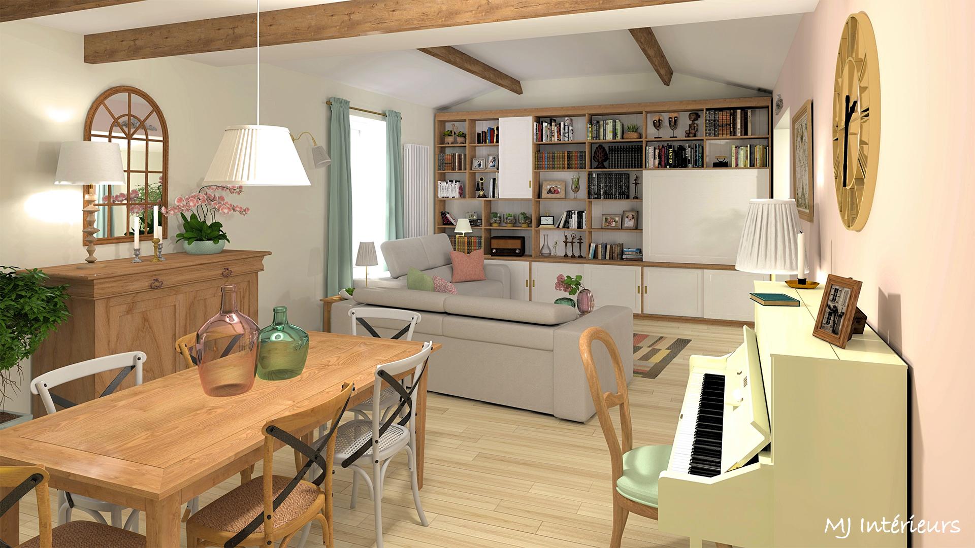 Sans changer l'agencement général de la pièce, création d'une ambiance douce et chaleureuse dans un style campagne-chic en utilisant une grande partie du mobilier existant excepté la table basse et les chaises de la salle à manger.