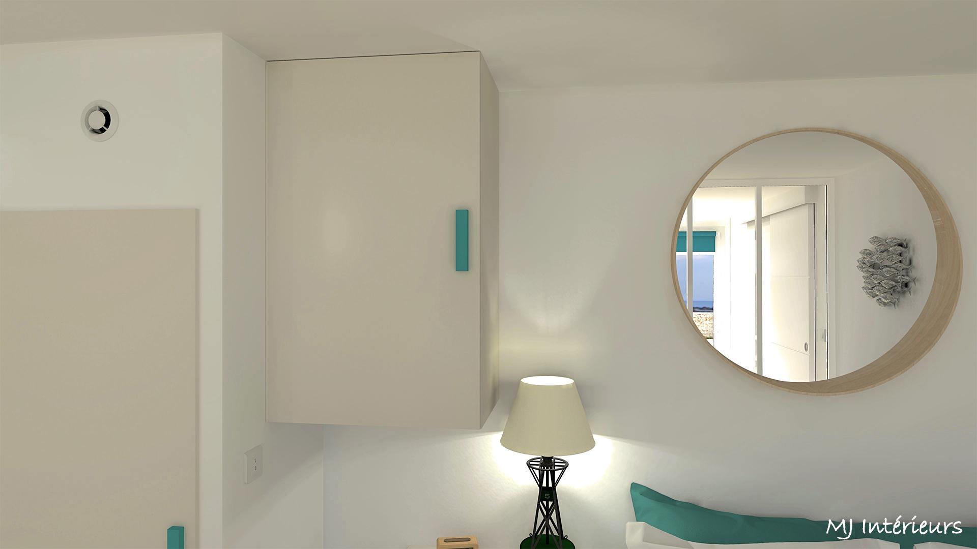 Création d'une ambiance épurée et lumineuse dans des nuances de blanc et "gris brume" relevées par un camaïeu de bleu-vert "canard" et de discrètes touches de bois clair au niveau du mobilier proposé.